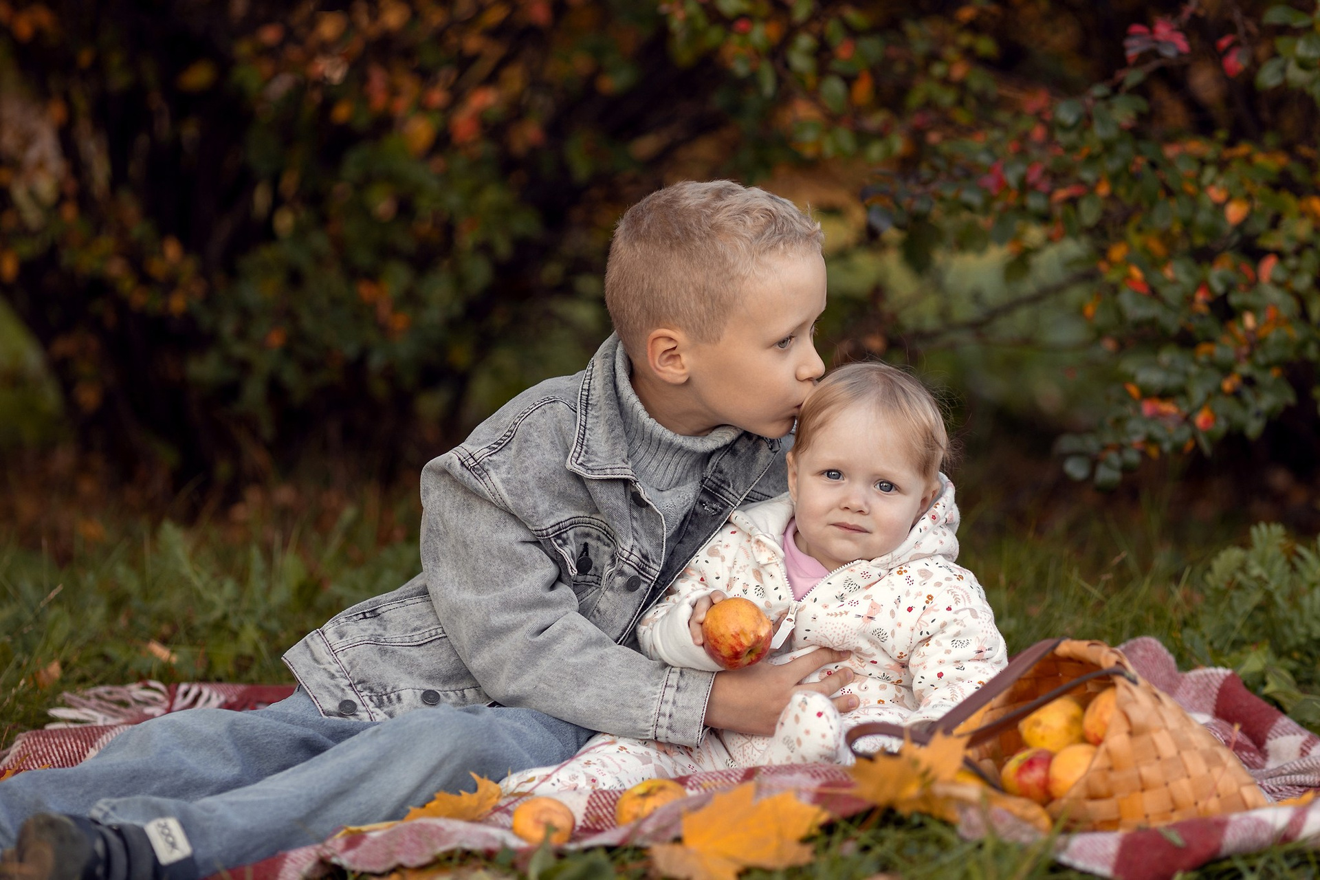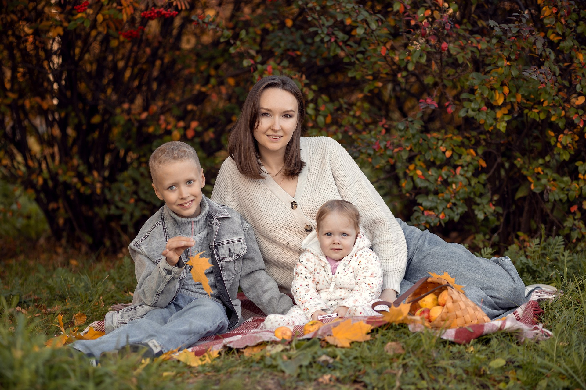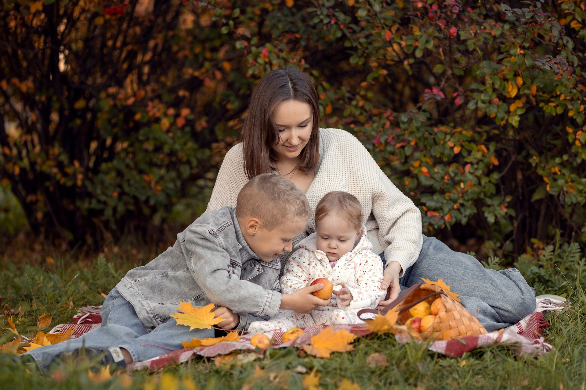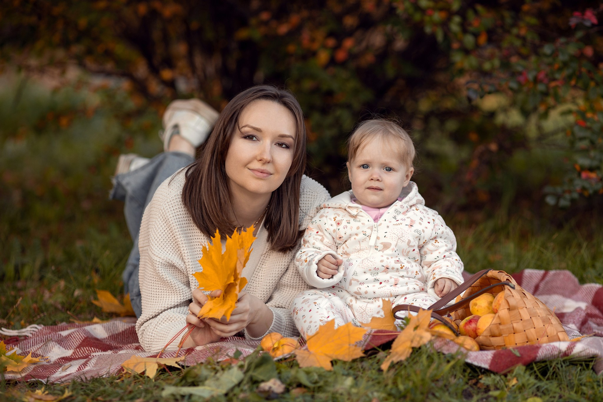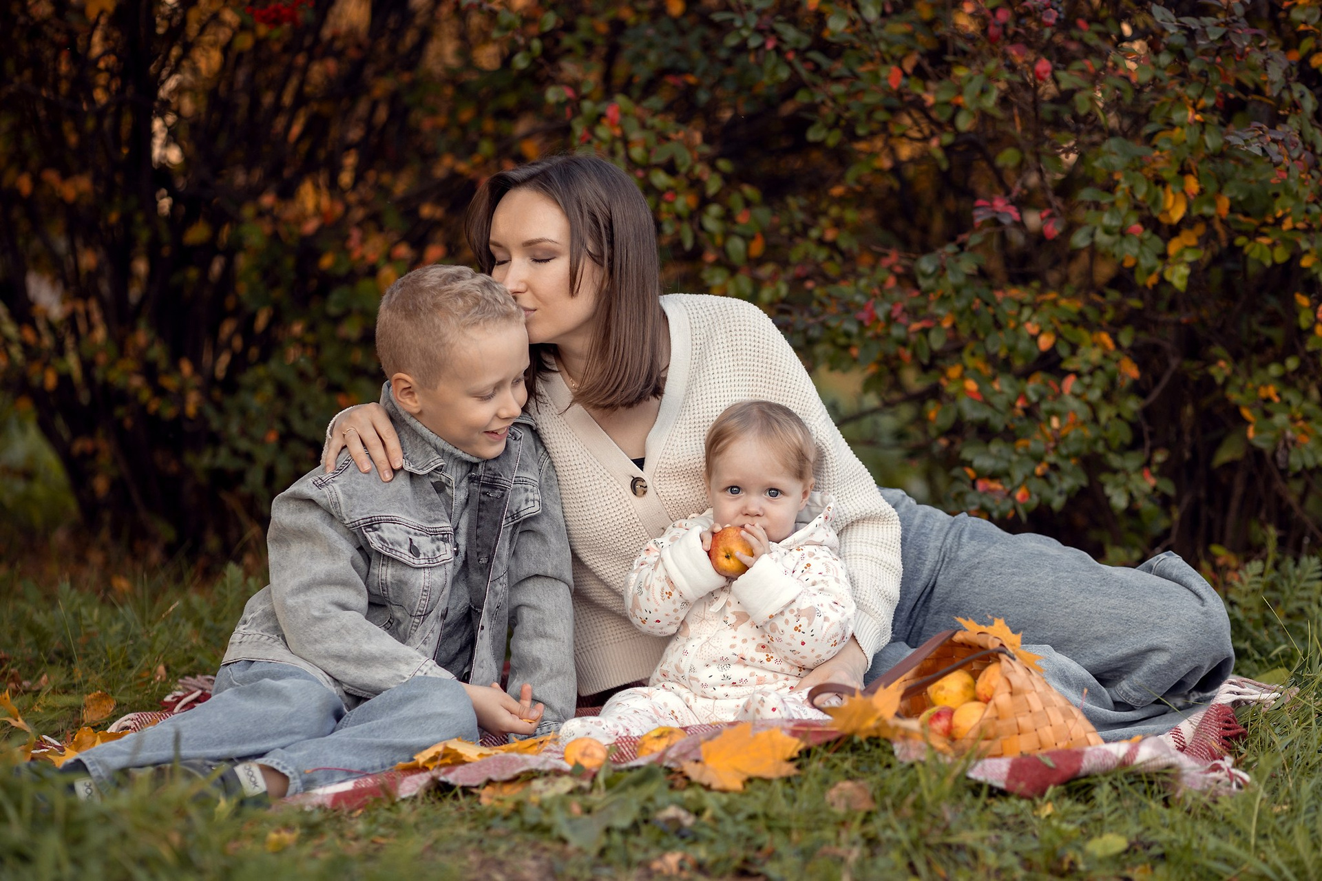 Уютный плед, корзинка с яблочками, кленовый желтые листья — то что нужно для осенней семейной фотосессии. Теплые объятия, нежные поцелуи и искренние улыбки сохраним мы с вами на память!